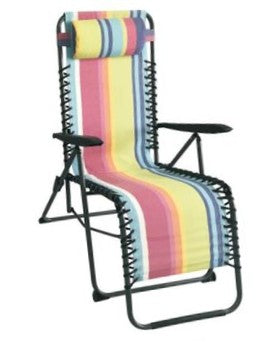 Steel frame relaxer chair is adjustable and comes with striped cushion. Size: W 60 x D 98 x H 75cm. Chair is adjustable with multiple reclining options and comes with padded cushion. Can be folded up for easy storage. Light weight and sturdy, making it ideal for gardens and sunny...